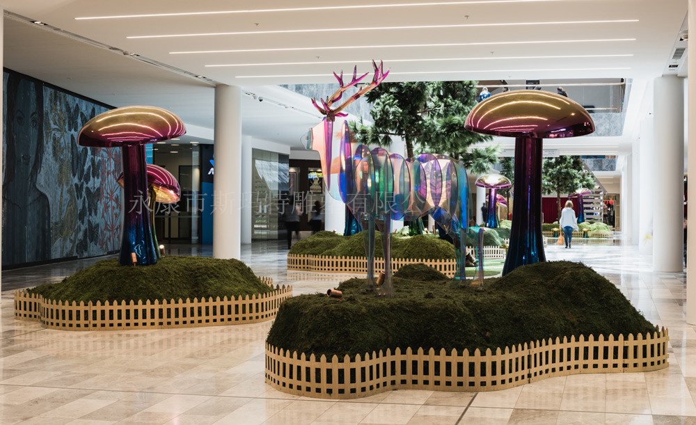 不銹鋼雕塑蘑菇、熊、遠(yuǎn)處還有鹿,栩栩如生有沒有,讓人仿佛來到了森林中一樣。