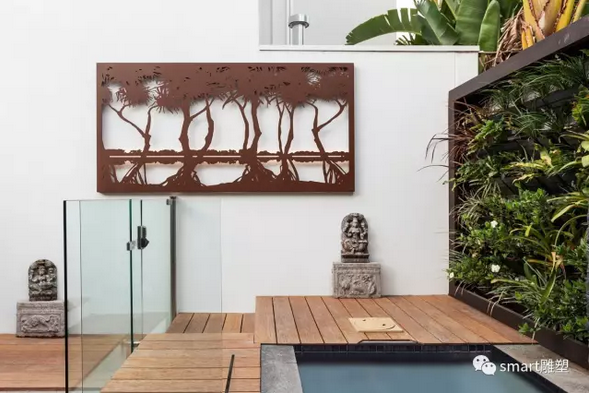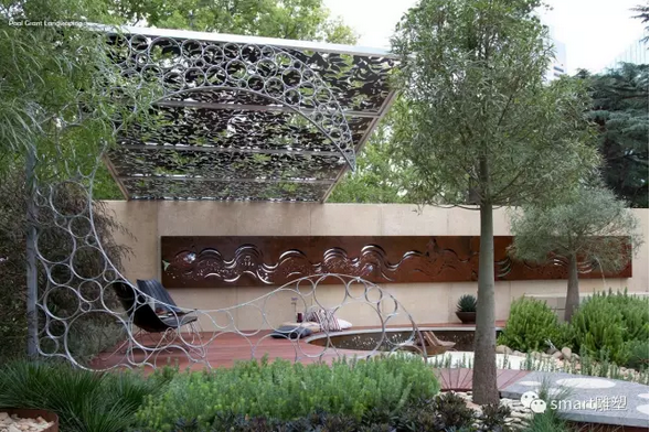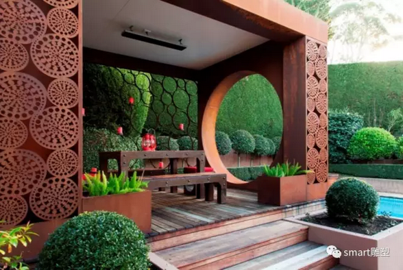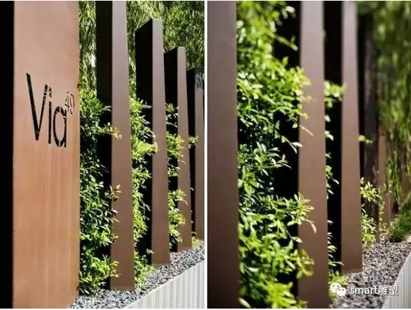 它具有突出的視覺(jué)表現(xiàn)力,會(huì)隨著時(shí)間而變化,其色彩明度和飽和度比一般的構(gòu)筑物材料要高,因此在園林綠植背景下容易突顯出來(lái)。耐候鋼雕塑會(huì)隨著時(shí)間而發(fā)生變化,其色彩受環(huán)境、氣候影響變化較大,放置很久之后容易從鮮亮的紅褐色變成暗淡的深灰色,隨著時(shí)光老化,使其充滿美感的色彩和質(zhì)感體現(xiàn)出別出心裁的藝術(shù)魅力,還可以追溯場(chǎng)地的歷史感、記錄時(shí)間的瞬間感、延伸場(chǎng)地的生命力,體現(xiàn)可持續(xù)的景觀。